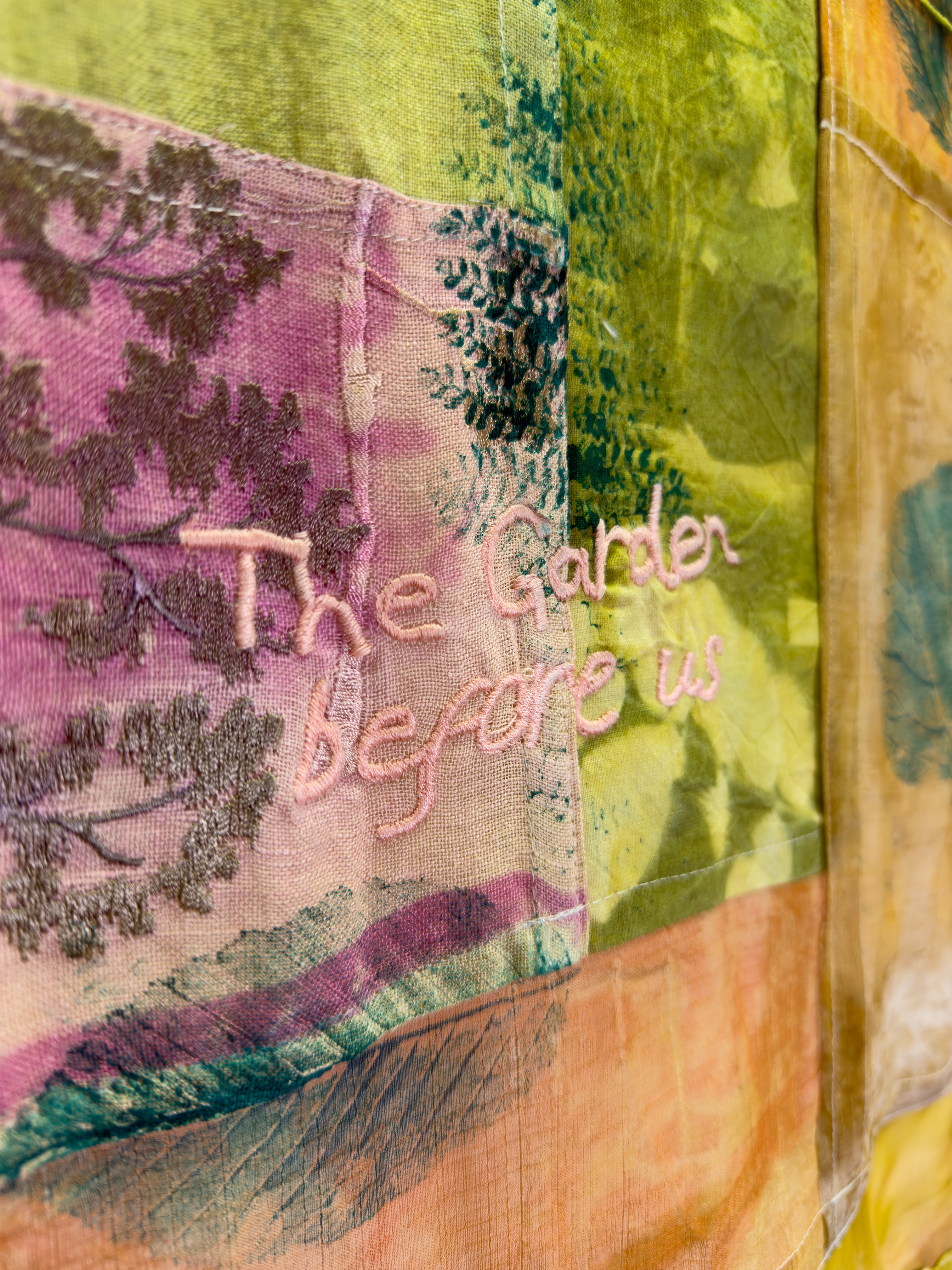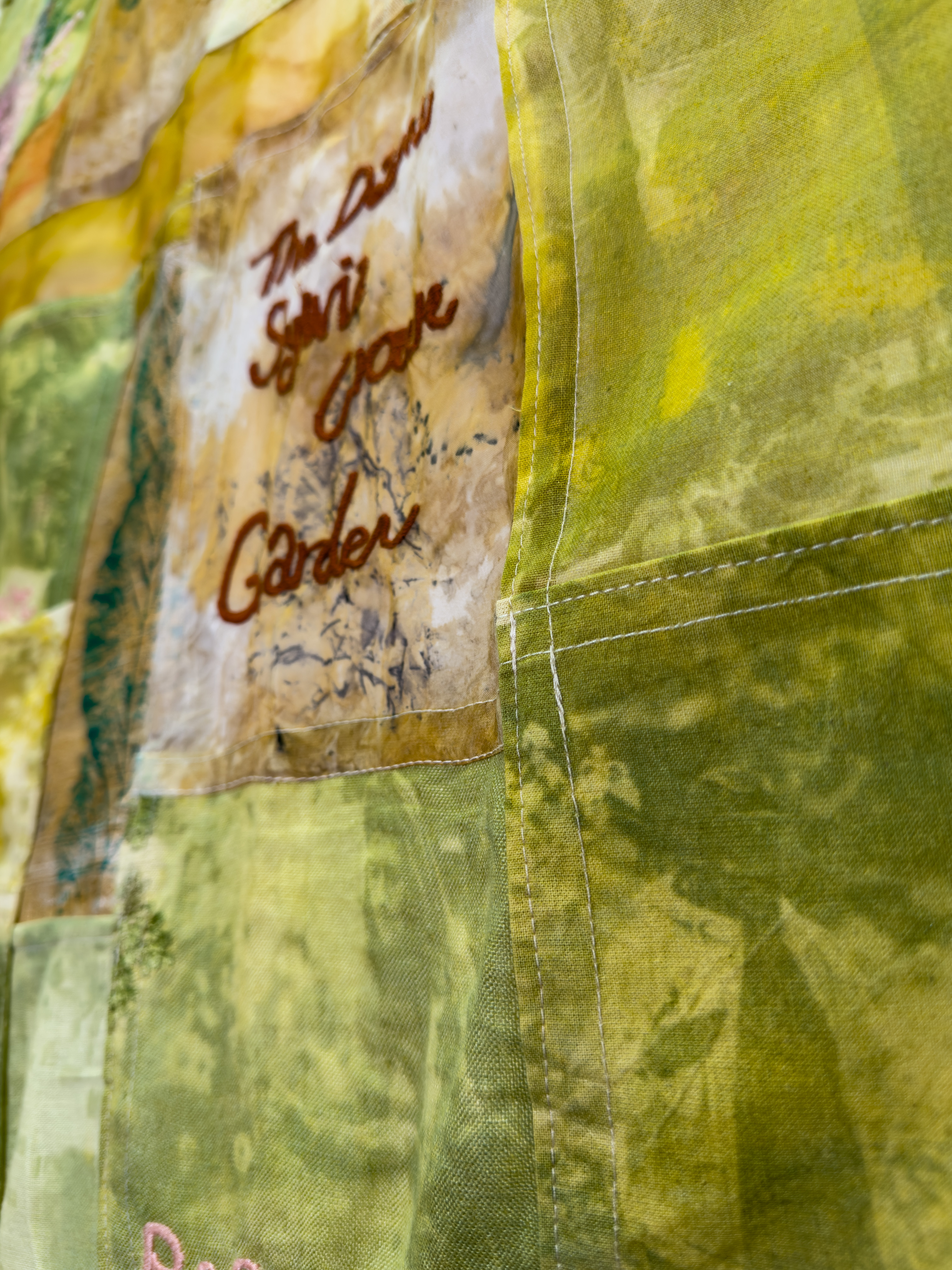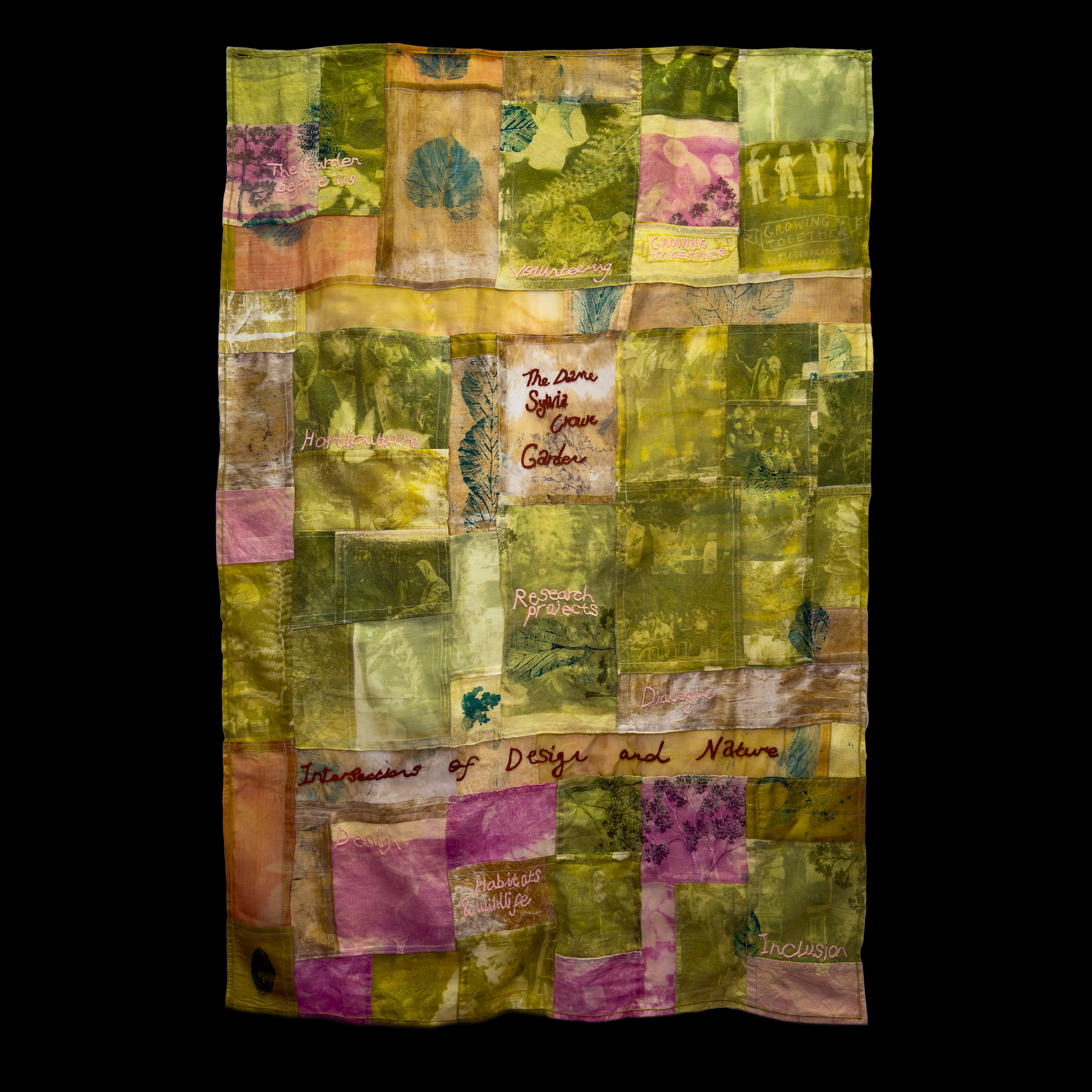Co-designed with the Gardens' curator, this banner serves as a textile record of the Dame Sylvia Crowe Garden's first 5 years of planting. From a pesticide-laden 'wasteland' in 2020, the garden has been painstakingly cared for by a passionate group of volunteer gardeners and urban horticulturists. The banner was co-created during a workshop session let by Christie Swallow and Rhea Martin, where past volunteers and current participants contributed to monoprinting with solarfast and natural dyeing with pigment derived from the garden, all on organic textiles donated by the wider community. The final piece sets out the story of the garden through live biota colouring the fibres and reproductions of key moments. Prints from the autumnal falling leaves bring together this unique community space.