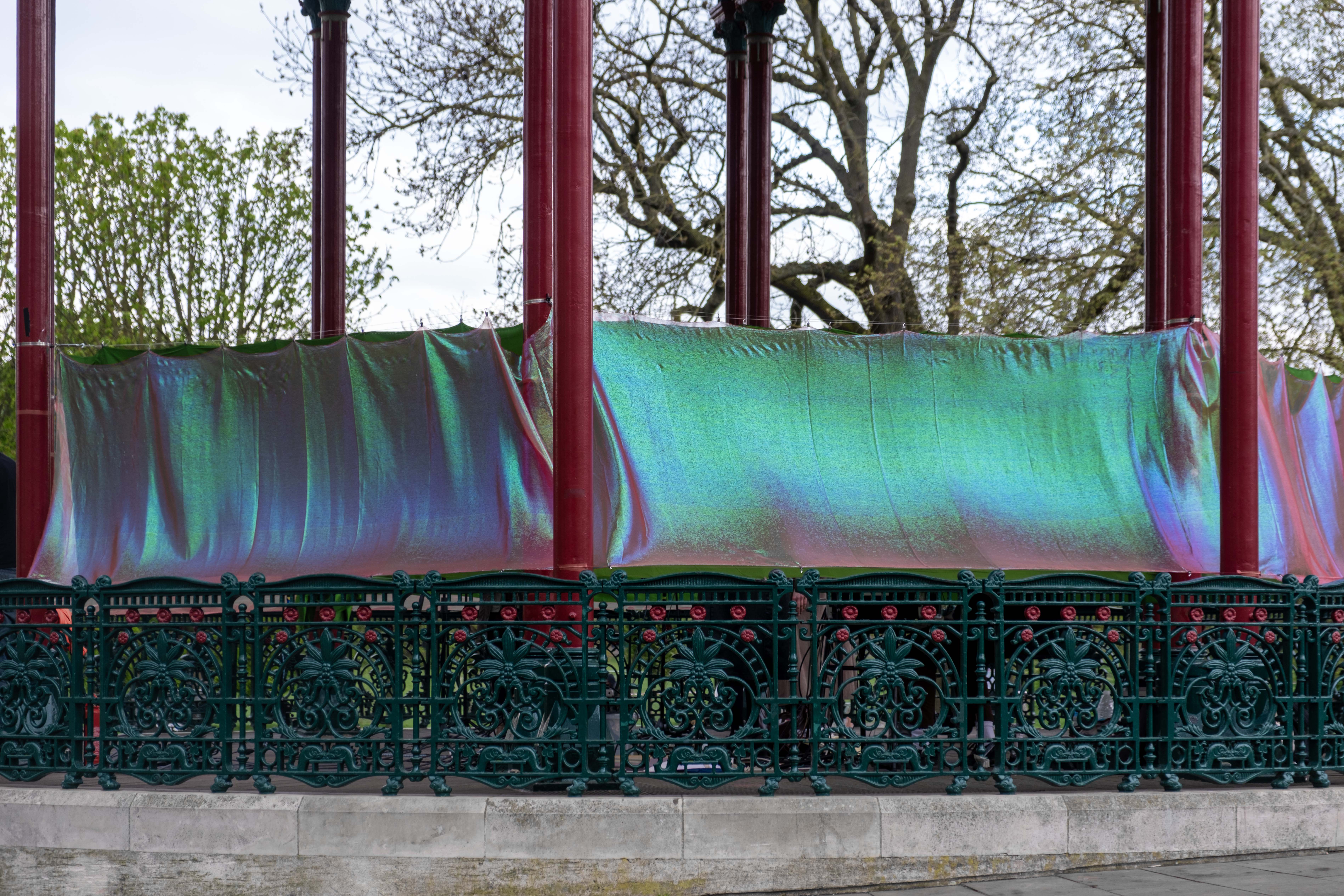 Humans were invited to Pandemonium, but they weren't the main audience. The concert was designed to privilege the Parakeets' line of sight over the humans', using eye catching textiles to shield performers from the wind while not infringing on the sightline from the tree canopies where Paraeets hang out.